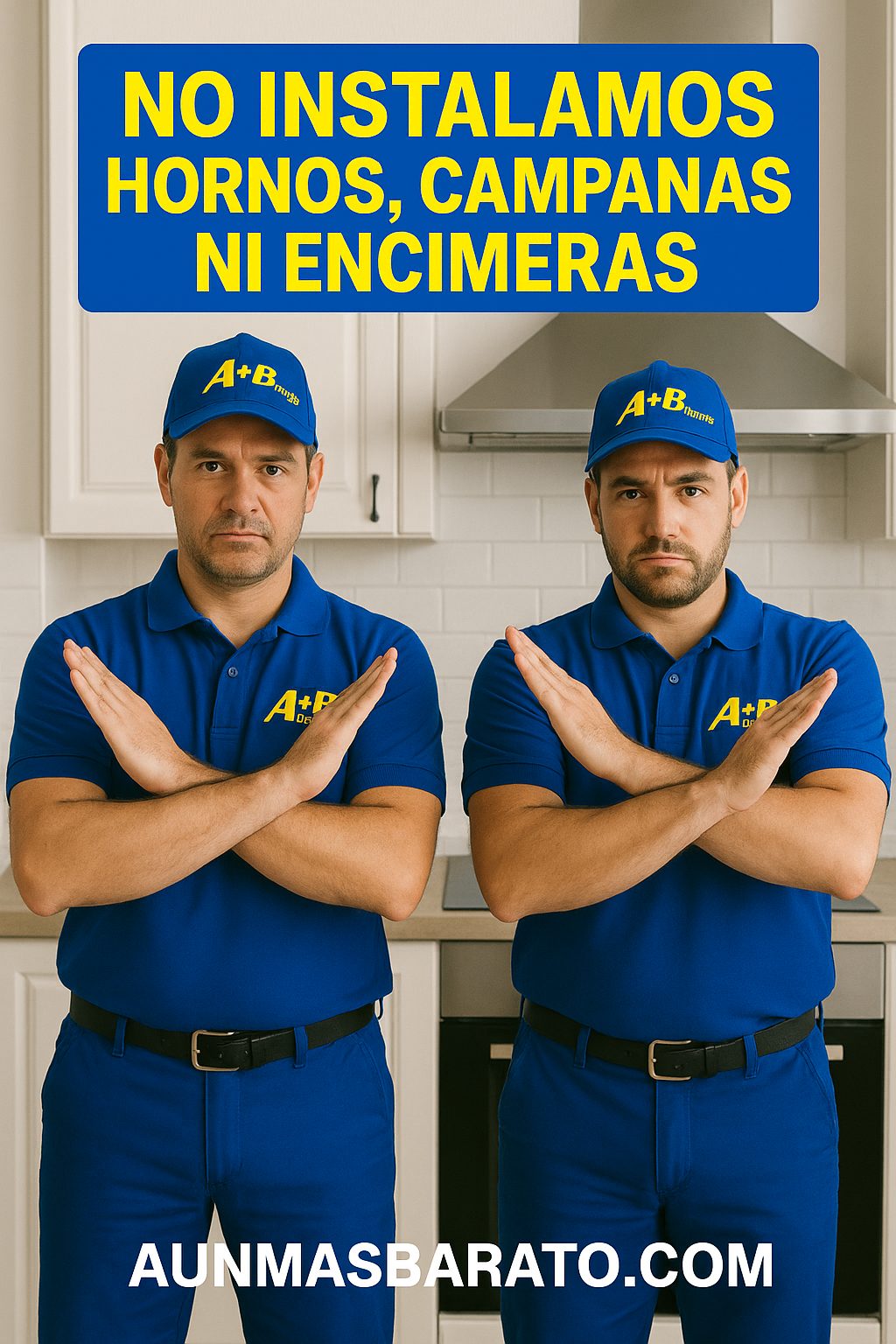 2-NO SE INSTALAN HORNOS, ENCIMERAS, GRIFOS, FREGADERAS, CAMPANAS ni todo lo que sea LÍNEA DE ENCASTRE. NUESTRO PERSONAL NO MANIPULA NI GAS, NI ELECTRICIDAD, NI FONTANERÍA. NI COLOCACIÓN DE TELEVISORES MEDIANTE SOPORTE EN LA PARED, NI ELECTRODOMÉSTICOS INTEGRABLES.