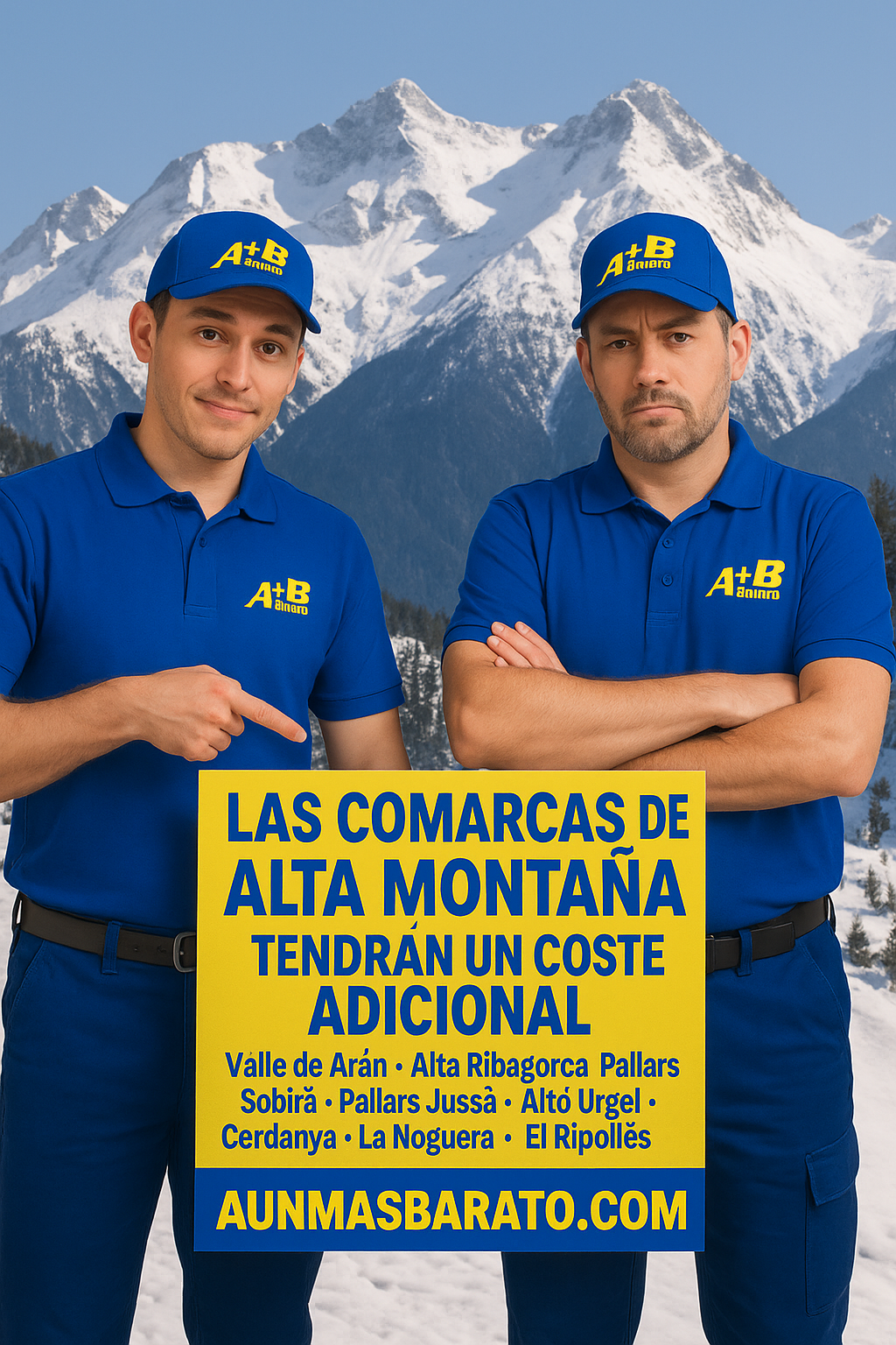 1- Las comarcas catalanas de alta montaña como VALL D`ARAN, ALTA RIBAGORÇA, PALLARS SOBIRA, PALLARS JUSSA, ALT URGELL, LA CERDANYA, LA NOGUERA, EL RIPOLLES tendrán un coste adicional. Le recomendamos que consulten a nuestros comerciales y ellos les informarán.